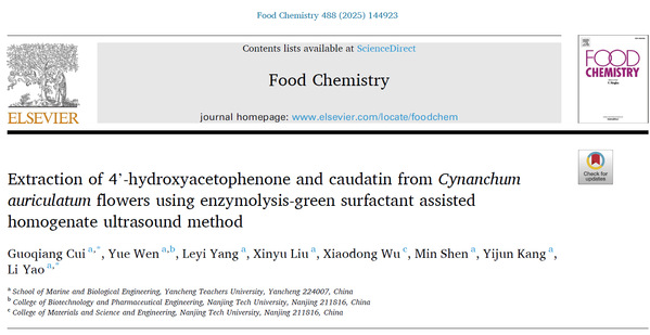 5月26日,食品领域国际权威期刊Food Chemistry(中科院一区,影响因子8.5)在线发表了公司教师崔国强博士的研究论文“Extraction of 4’-hydroxyacetophenone and caudatin from Cynanchum auriculatum flowers using enzymolysis-green surfactant assisted homogenate ultrasound method”。