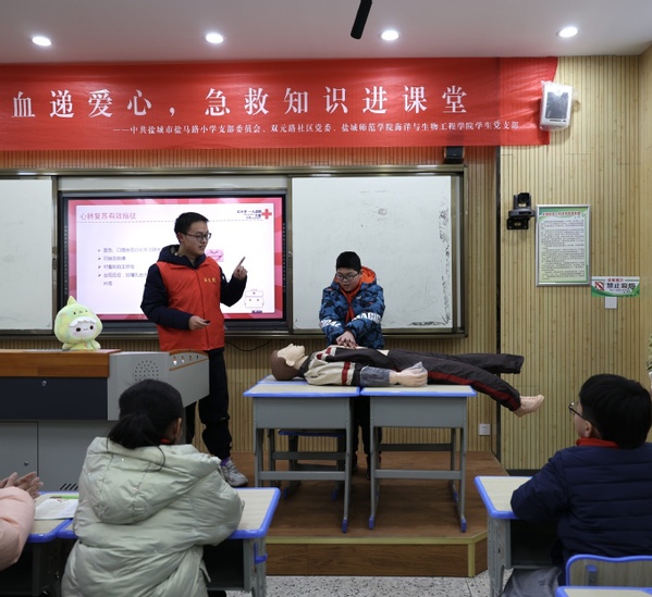 此前,海生院员工党支部员工党员前往盐城市红十字会应急救护培训基地,参加了“关爱生命救在身边”科普宣教活动,学习了心肺复苏、气道异物梗阻、AED使用等理论知识,跟随培训师掌握了“海姆立克法”的操作技能,并取得了心肺复苏培训证书,为本次爱心课堂活动做了充分的准备。