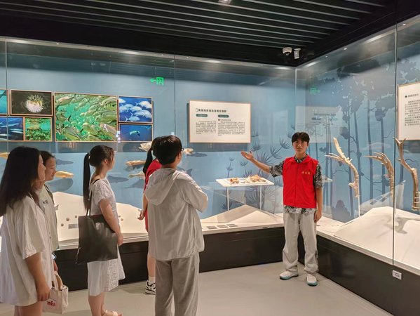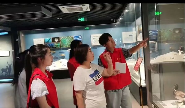 学习交流结束后,团队成员结合自身对于保护湿地生态的理解,给前来博物馆参观的游客进行展馆讲解,宣传湿地保护的重要性以及盐城人民为促进黄海湿地保护所做的努力。此外,团队成员采访了游客对于湿地保护的看法,并结合生物专业知识和此次实践所获对游客开展环保科普宣传。