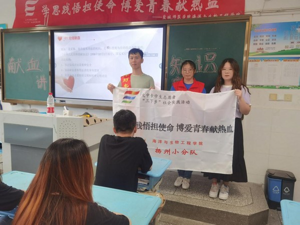 在本次实践活动中,团队在扬州市江都区实验初中开展以无偿献血点亮生命为主题的献血知识讲座。团队成员事前准备充分,针对同学们关心的无偿献血问题,图文并茂地介绍了无偿献血法律法规、无偿献血的好处、献血流程及注意事项等。整个课堂气氛活跃,同学们不仅认真听讲,还与志愿者们频繁互动,以期更多地了解献血的相关知识。