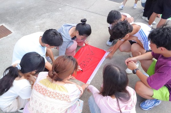 “今天我要谢谢你”、“遇三请撤离”等破冰小游戏后,同学们随机分为五队。各队协力完成队名、口号、队旗及队形设计,并通过“叫出你的名字”游戏快速记住队友姓名,增强团队熟悉感和凝聚力。