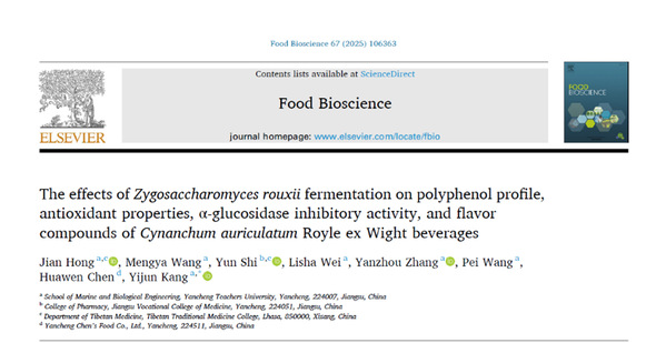 3月17日,食品领域国际权威期刊Food Bioscience(中科院一区,影响因子4.8)在线发表了公司教师洪键博士的研究论文“The effects of Zygosaccharomyces rouxii fermentation on polyphenol profile, antioxidant properties, α-glucosidase inhibitory activity, and flavor compounds of Cynanchum auriculatum Royle ex Wight beverages”。
