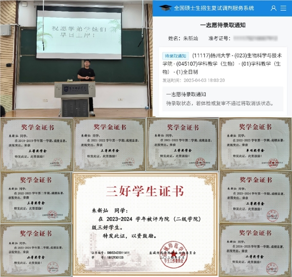 2021年初秋,带着部队里练就的干劲儿和沉稳,身材健壮的朱新灿回到了校园。他最初在药公司制药工程专业学习,但在入伍期间受张桂梅老师个人事迹的感化,于是一入学就转专业到海生院的生物师范,励志成为一名光荣的人民教师。他拿出在部队执行任务那股认真劲儿,上课听得特别专注,生怕漏掉老师讲的每一个细节。这股专注和韧劲儿用在学习上,效果立竿见影。从2021到2025年这四年里,他的成绩稳步提升,多次拿到校级三等和二等奖学金,累计获八次学业奖学金,被评为院级“三好员工”。毕业规划中也继续提升教师素养,考研目标指向扬州大学学科生物专业。备考期间,图书馆自习室和公司考研教室是他常驻的“战场”,复习资料和粉笔是他的“枪支子弹”,最后在2025年3月28日以高分取得“战斗”的胜利,并主动向学弟学妹传经送宝。