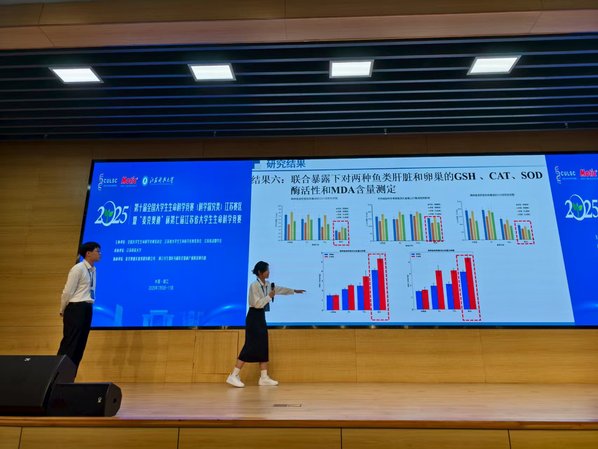本次赛事采取“省赛—国赛二合一”模式,自2024年10月启动至2025年7月闭幕,历时九个月,吸引了全省44所高校共1106个项目报名参赛。经过网络评审,208个项目进入现场决赛。在江苏赛区闭幕式上,组委会从省赛一等奖中精选出2项创新成果进行展演。由公司陈烨曦、纪惺惺等同学完成,卞勋光老师指导的《“钛”险“塑”缚:防晒成分与微塑料协同对淡水鱼类的毒性效应研究》成功入选。该项目聚焦生态环境热点问题,创新构建污染物协同效应评估模型,为水产病害防控提供科学依据,获专家高度评价。
